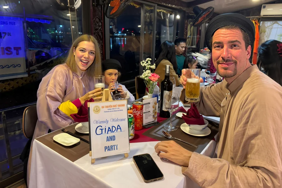 We needed something that combined culture, entertainment, and genuine engagement, without requiring Marco to sit still for hours or feel rushed. When I read reviews about a family-run dinner cruise on the Perfume River, I was cautiously optimistic. One review from another family with children mentioned how “engaged” their kids were throughout the entire experience, and how the hosts were incredibly patient and accommodating. As an Italian family used to child-centered hospitality in restaurants back home, I was curious to see how this Vietnamese family operation would handle a six-year-old.